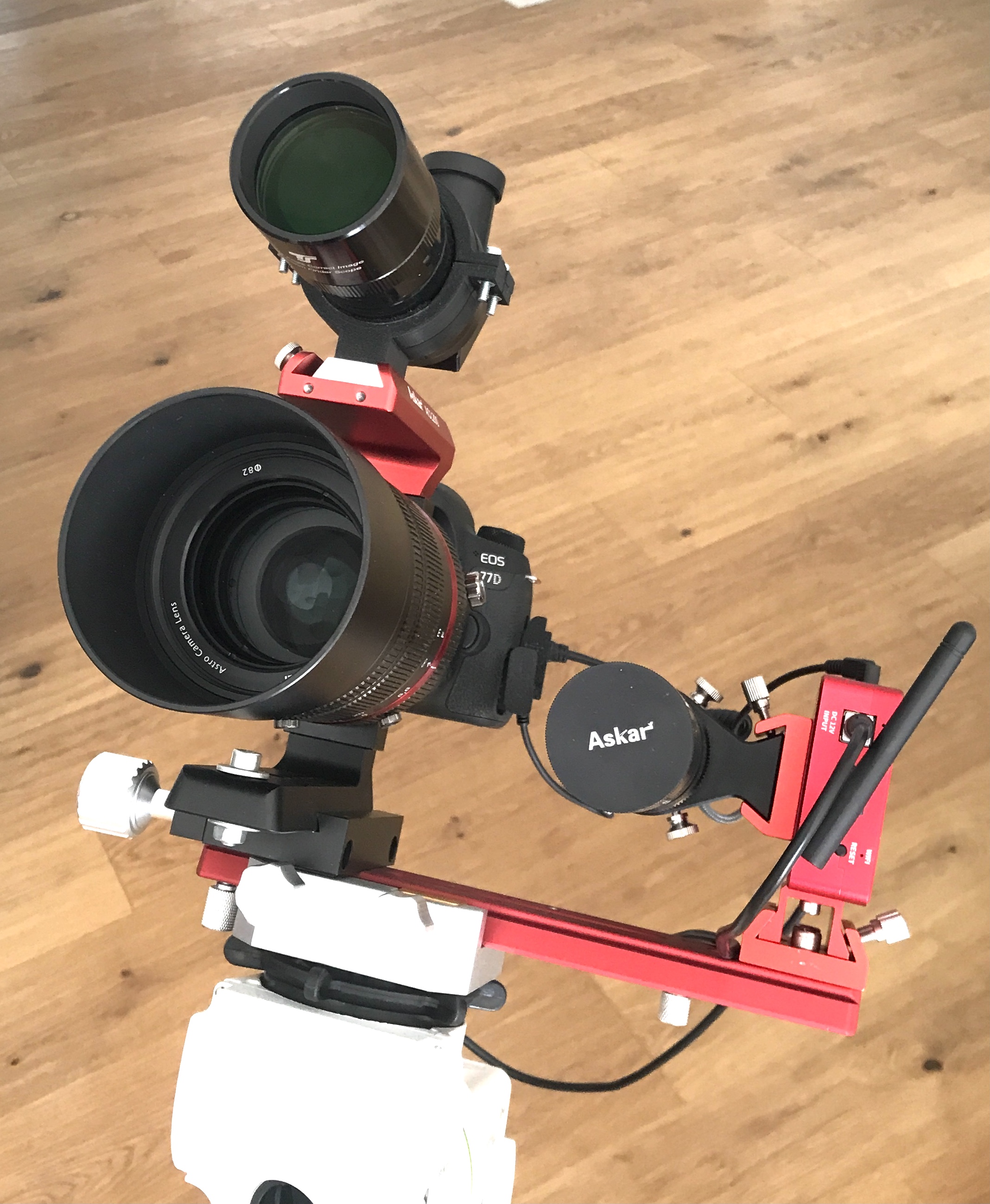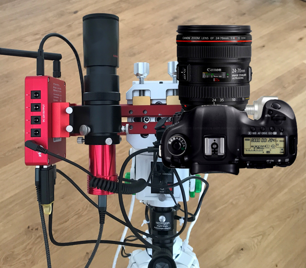 rechts Kamera und Teleskop. Alles perfekt im Gleichgewicht, kurz verkabelt und in Klemmen sicher aber abnehmbar montiert.