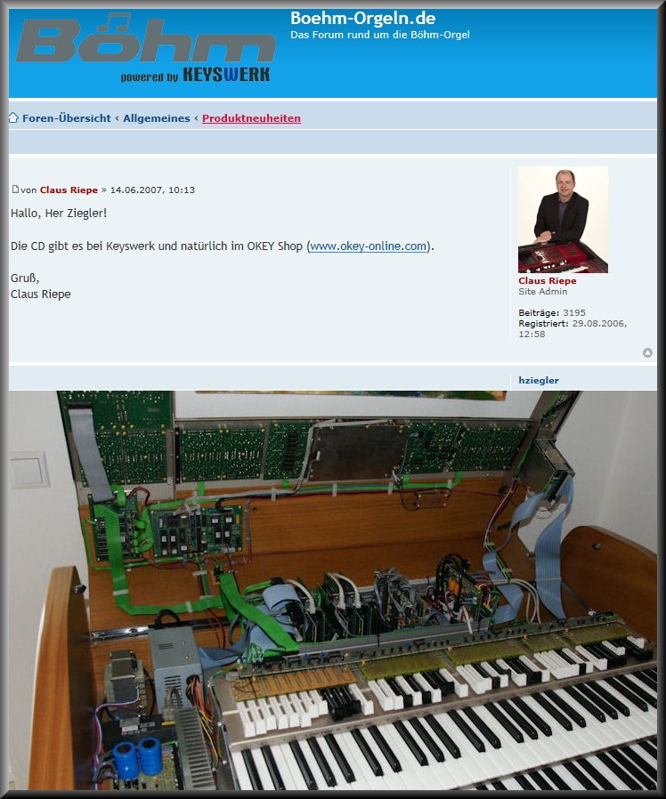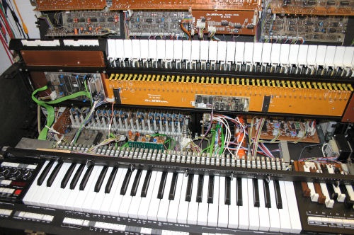 Verdrahtet wie ein Computer. Bauzeit ca. 1 Jahr vom Löten aller Platinen bis zur anschliessenden Verdrahtung und Inbetriebnahme. Die Lieferung aller elektronischen Bauteile erfolgte in Tüten, auch das Orgelgehäuse als Bausatz. Gute Kontakte zu Dr. Böm waren hilfreich